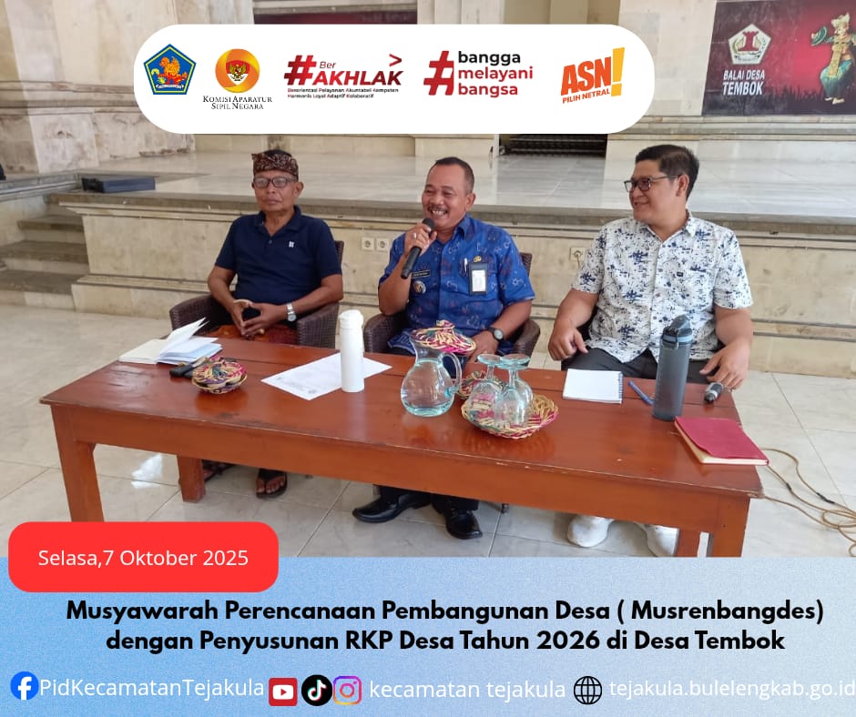 Tembok, - Selasa, 7 Oktober 2025, Kasi Pembangunan Kecamatan Tejakula I Nyoman Suarsana,S.Sos., menghadiri Acara Musyawarah Perencanaan Pembangunan Desa (Musrenbangdes) dengan Penyusunan RKP Desa Tahun 2026 bertempat di Balai Desa Tembok.
