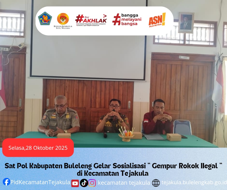 Tejakula ,- Selasa,28 Oktober 2025, Pukul 09.30 Wita, berlangsung Sosialisasi Gempur Rokok IIegal bertempat di Ruang Rapat Kantor Camat Tejakula, acara di buka oleh Camat Tejakula Kadek Agus Hartika, ST, M.AP dan di dampingi Kepala Seksi Ketentraman Ketertiban dan Satuan Polisi Pamong Praja Kecamatan Tejakula I Ketut Mastrika. Tim Kabupaten dalam Sosialisasi Gempur Rokok Ilegal sesuai perda guna menekan peredaran rokok ilegal di wilayah Kecamatan Tejakula yang diselenggarakan oleh Satuan Polisi Pamong Praja (Satpol PP) Kabupaten Buleleng.