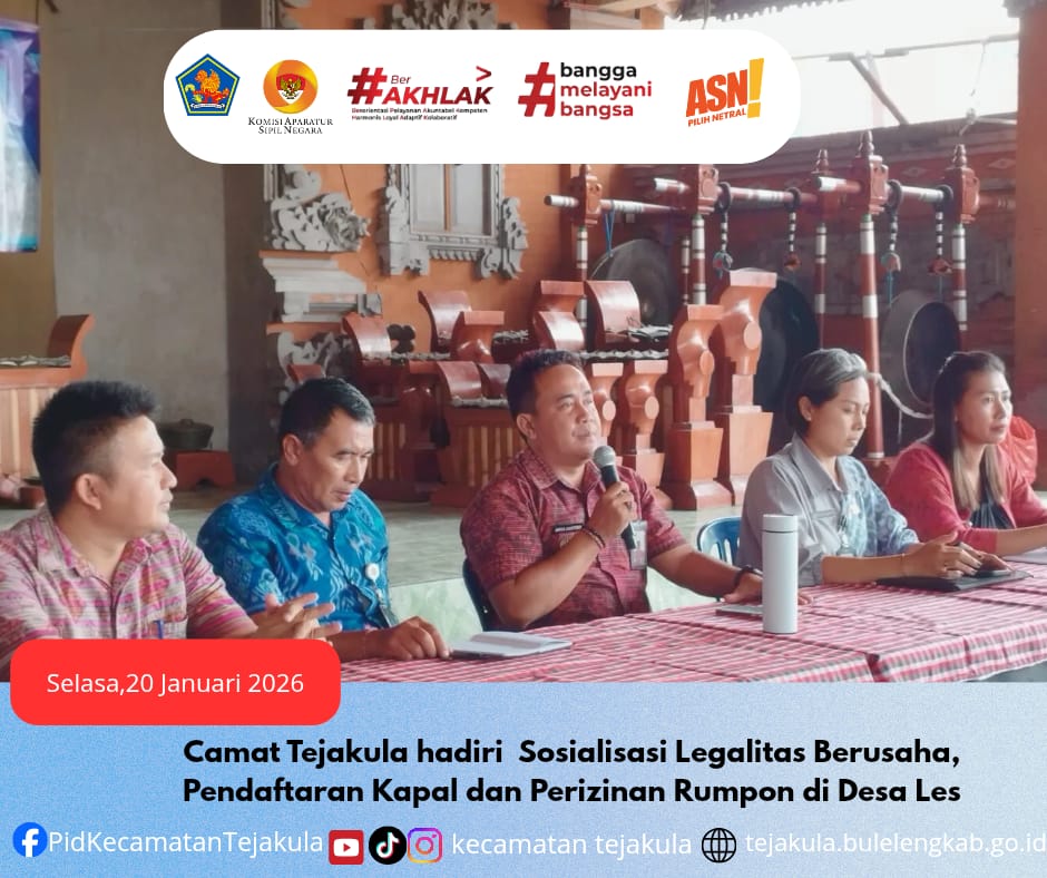 Camat Tejakula Kadek Agus Hartika,ST.,M.A.P., menghadiri Sosialisasi Legalitas Berusaha, Pendaftaran Kapal dan Perizinan Rumpon yang di selenggarakan Pemerintah Provinsi Bali melalui Dinas Kelautan dan Perikanan (DKP), bekerja sama dengan Yayasan Konservasi Alam Nusantara (YKAN), Selasa (20/1/2026).