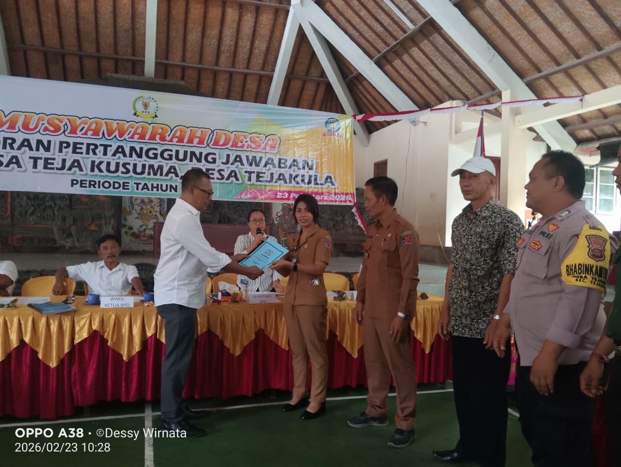 Tejakula, Senin, 23 Pebruari 2026 bertempat di Balai Serbaguna Desa Tejakula,Kasi Sosial dan Budaya mewakili Camat Tejakula menghadiri Kegiatan Musdes dengan agenda laporan penyelenggaraan Pemerintah Desa Tejakula Tahun Anggaran 2025, laporan pertamggungjawaban Bumdesa Tahun 2025 serta rencana kerja tahun 2026, laporan pengawas Bumdes, penyerahan bantuan dari Bumdesa kepada beberapa warga secara simbolis dan Kegiatan dihadiri oleh Perbekel Desa Tejakula, Jro Bandesa Adat Tejakula, Ketua beserta anggota BPD, Pengawas serta pengurus Bumdes, staf Desa, BABINSA , Babinkamtibmas, serta perwakilan masyarakat.
