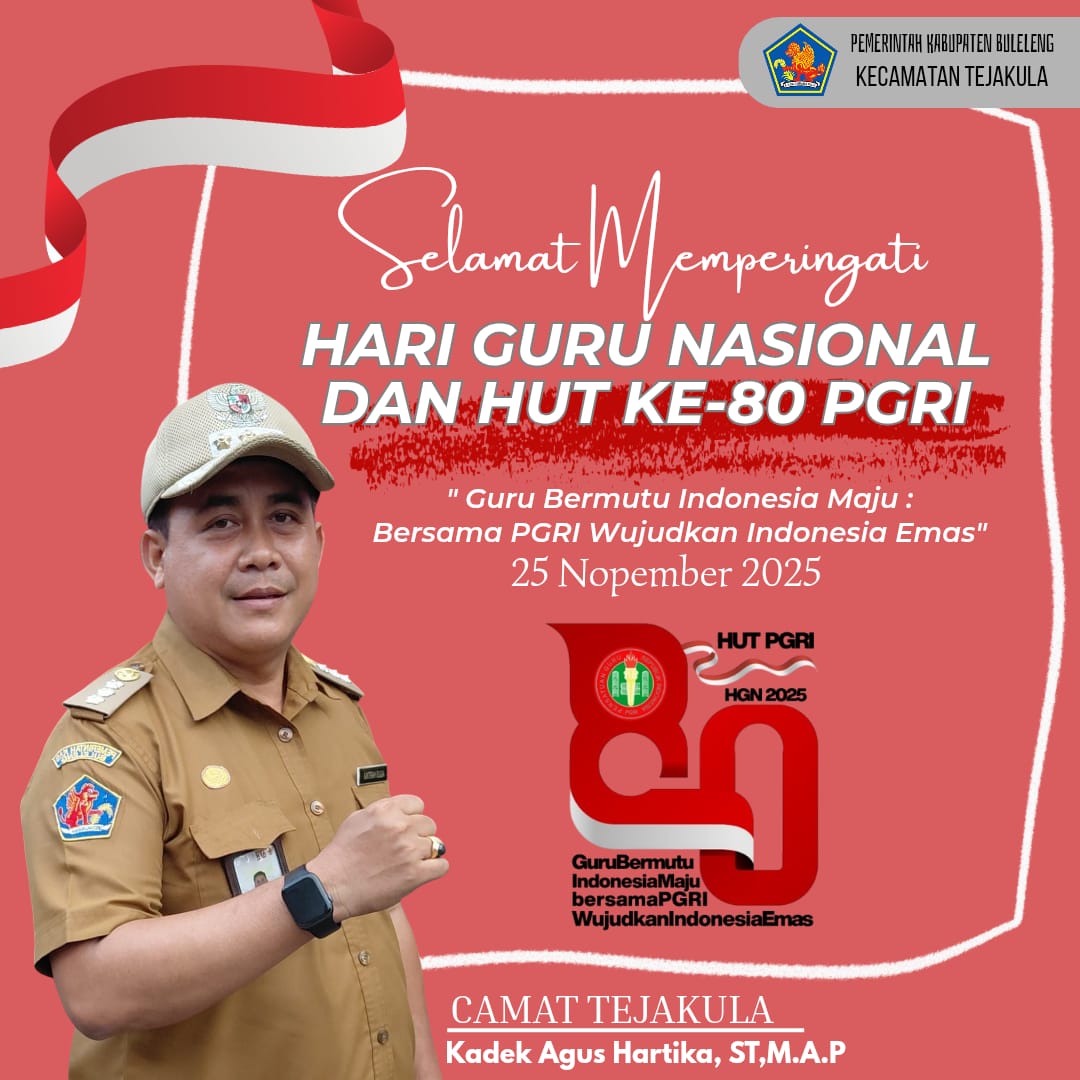 Camat Tejakula Kadek Agus Hartika, ST,.M.A.P., bersama seluruh staf mengucapkan Selamat memperingati Hari Guru dan HUT ke-80 PGRI.