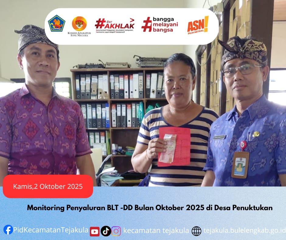 Penuktukan,- Kamis 2 Oktober 2025,Bertempat di Kantor Desa Penuktukan, Kasi Pemerintahan Kecamatan Tejakula beserta staf melaksanakan kegiatan Monitoring Penyaluran BLT-DD Bulan Oktober 2025 yang diserahkan oleh kasi Pemerintahan Desa Penuktukan.