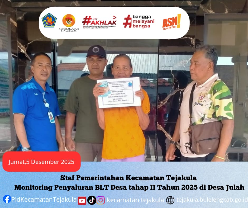 Julah , Jumat 5 Desember 2025. Penyaluran BLT DD Bulan Desember 2025 Staf seksi Pemerintahan Kecamatan Tejakula melaksanakan pemantauan penyaluran BLT DD di Desa Julah, yang diberikan kepada masyarakat miskin berupa uang berjumlah Rp. 300.000 per bulan yang di serahkan langsung oleh Kasi Pemerintahan Desa Julah dan didampingi Ketua LPM Desa Julah.