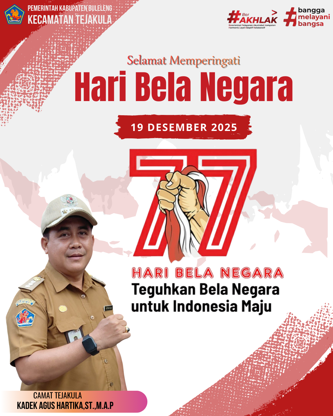 Camat Tejakula Kadek Agus Hartika, ST.,M A.P., bersama seluruh staf mengucapakan Selamat Hari Bela Negara yang ke - 77 Tahun 2025 dengan tema " Teguhkan Bela Negara Untuk Indonesia Maju"