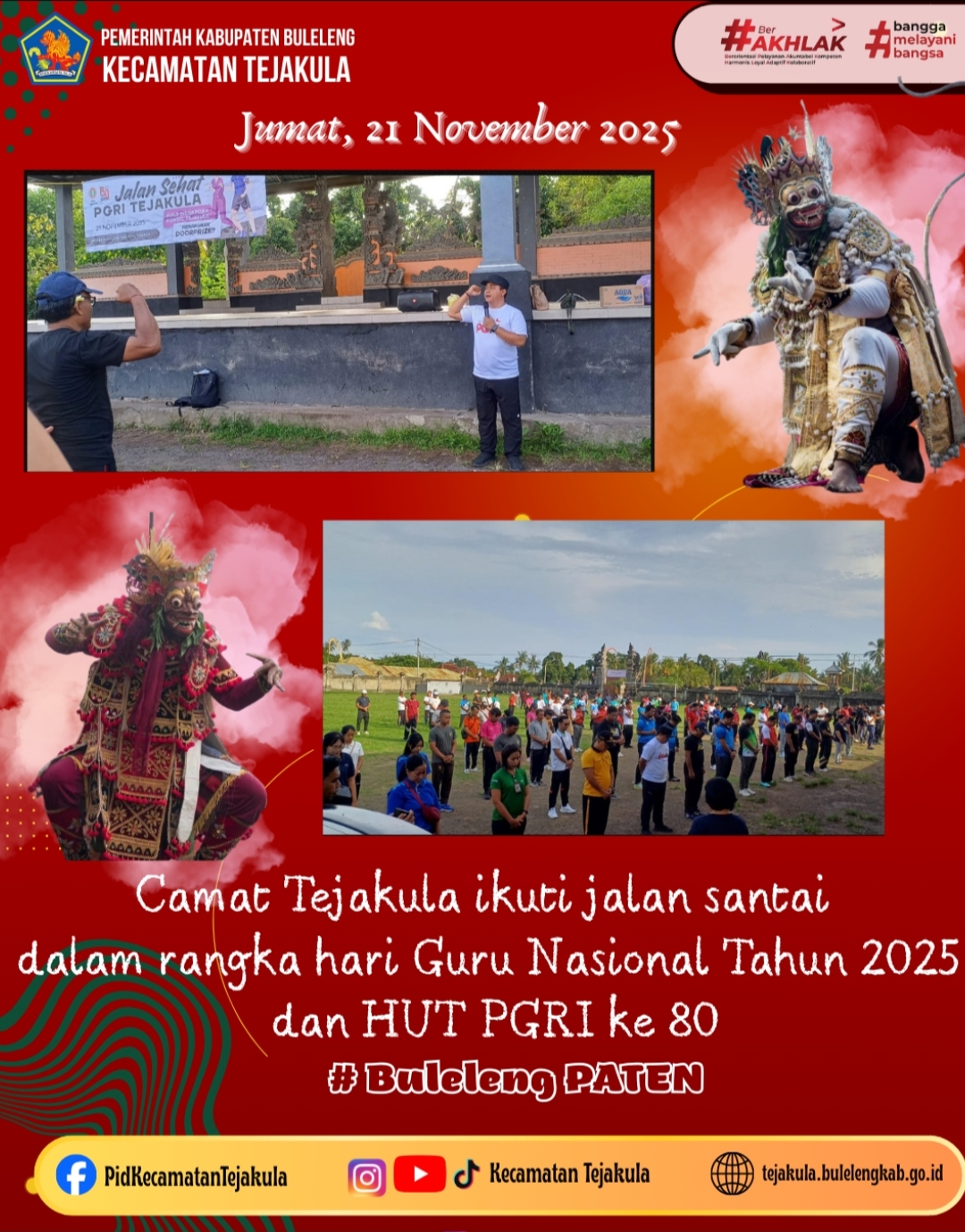 Camat Tejakula Kadek Agus Hartika, ST,.M.A.P., menghadiri dan membuka kegiatan Jalan Sehat Memperingati Hari Ulang Tahun Persatuan Guru Republik Indonesia (PGRI ke - 80 Tahun 2025, panitia HUT PGRI Kecamatan Tejakula menyelenggarakan Jalan Sehat bersama PGRI se - Kecamatan Tejakula dan KOPRI se - Kecamatan Tejakula yang mengambil start di Lapangan Teja Harum Desa Tejakula, Jumat (21/11/2025).