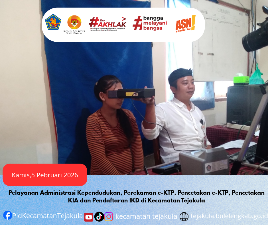 Pelayanan Administrasi Kependudukan, Perekaman e-KTP, Pencetakan e-KTP, Pencetakan KIA dan Pendaftaran IKD di Kecamatan Tejakula, Kamis 5 Februari 2026.