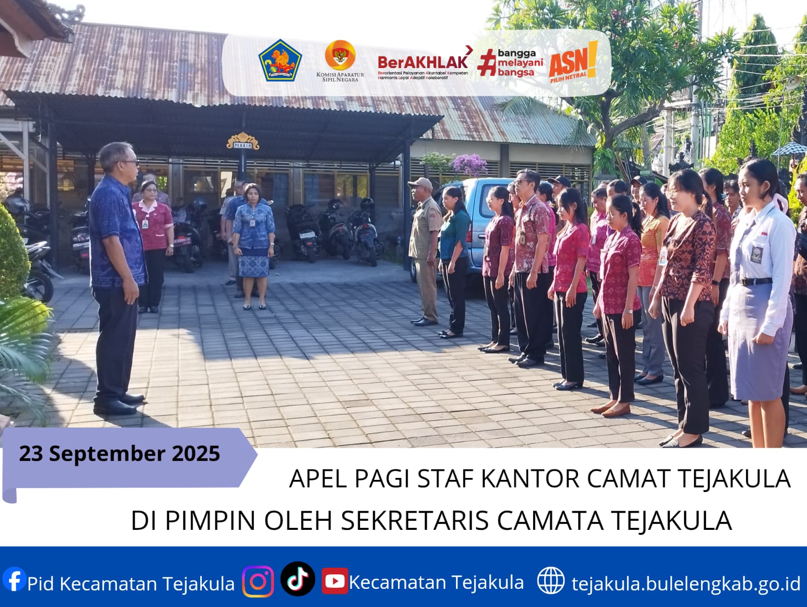 Tejakula, Selasa 23 September 2025, bertempat di Halaman Kantor Camat Tejakula dilaksanakan Apel Pagi dengan pembina Apel Sekretaris Camat Tejakula Made Sudarmika, S.Pd,M.Pd yang diikuti oleh Para Kasi dan Kasubag bersama staf Lingkup Kantor Camat Tejakula, dalam arahannya Sekretaris Camat Tejakula menekankan untuk tetap memberikan pelayanan kepada masyarakat dengan baik sesuai dengan 5S ( Senyum, Salam, Sapa, Sopan, Santun ) serta untuk selalu memberikan pelayanan yang cepat dan transparan yang mana pelayanan merupakan salah satu bagian dari value dari berakhlak yaitu berorientasi pada pelayanan dan penekanan pada penguatan Value BerAHKHLAK sebagai budaya kerja ASN, yaitu :