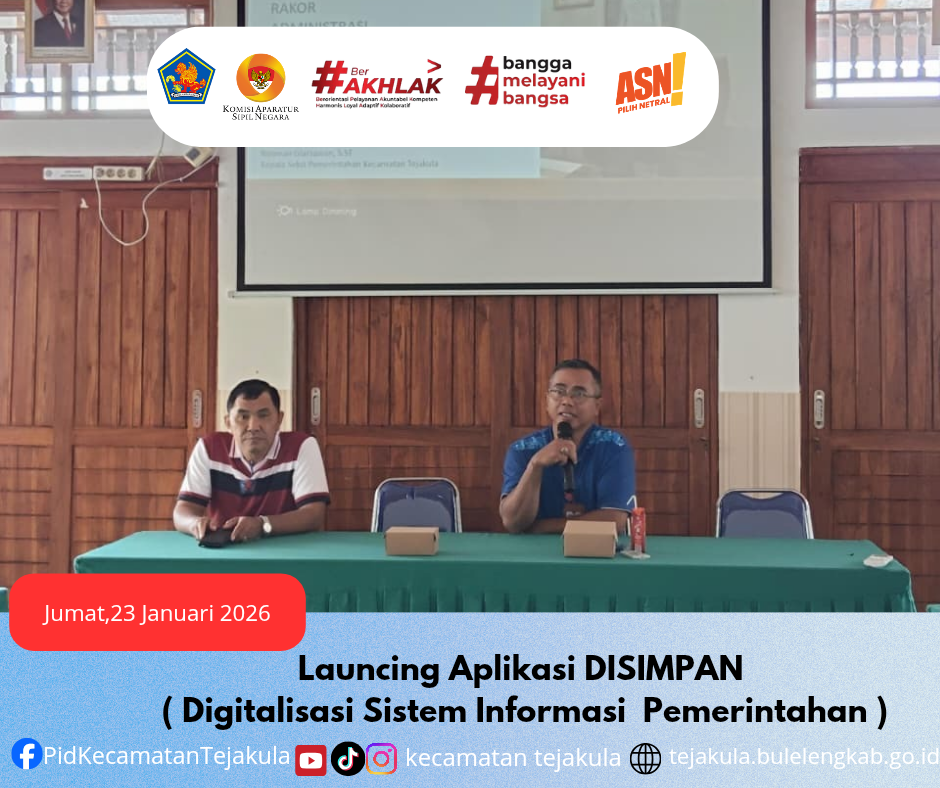 Jumat, 23 Januari 2026, Bertempat di ruang pertemuan kantor Camat Tejakula, diadakan Launcing aplikasi DISIMPAN (Digitalisasi Sistem Informasi Pemerintahan) yang dihadiri oleh Sekretaris Desa dan Petugas Operator Desa se-Kecamatan Tejakula.