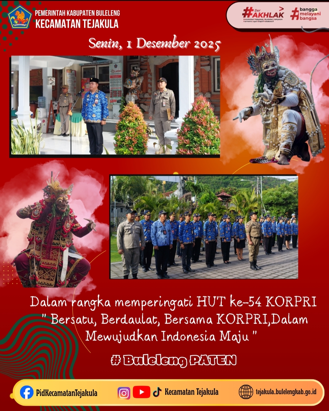 Tejakula,Senin 1 Desember 2025 – Dalam rangka memperingati Hari Ulang Tahun (HUT) ke-54 Korps Pegawai Republik Indonesia (KORPRI), " Bersatu, Berdaulat, Bersama KORPRI,Dalam Mewujudkan Indonesia Maju " Kecamatan Tejakula menggelar apel yang berlangsung di Halaman Kantor Camat Tejakula, Apel tersebut dipimpin langsung oleh Camat Tejakula Kadek Agus Hartika,ST.,M.A.P., yang bertindak sebagai inspektur upacara.
