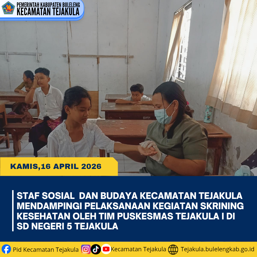 Kamis, 16 April 2026, Staf Seksi Sosial dan Budaya mendampingi pelaksanaan kegiatan skrining kesehatan yang dilaksanakan oleh tim Puskemas Tejakula 1 di lingkungan sekolah yang bertempat di SD N 5 Tejakula. Kegiatan yang dilaksanakan meliputi: pengukuran tinggi badan, pemeriksaan mata, penimbangan berat badan, dan pemeriksaan telinga.