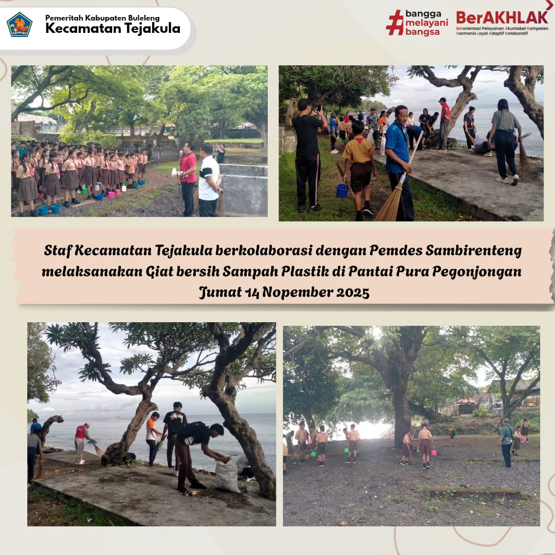 Dalam rangka menyukseskan program Pemerintah Kabupaten Buleleng, yaitu Gerakan Buleleng Bersih Sampah, Kecamatan Tejakula turut berpartisipasi melaksanakan aksi bersih di Pantai Pura Pegonjongan Desa Sambireteng, pada Jumat, (14/11).