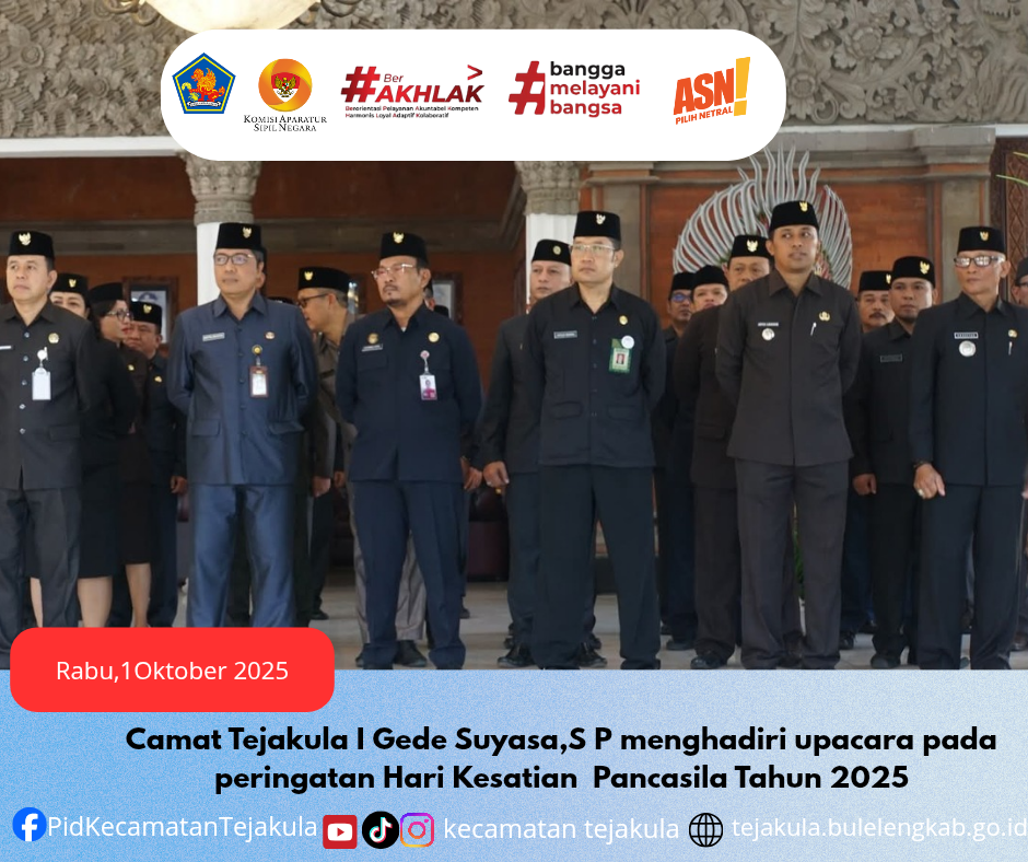 Buleleng, Rabu, 1 Oktober 2025-Camat Tejakula I Gede Suyasa,S.P., mengikuti Upacara dalam rangka memperingati Hari Kesaktian Pancasila Tahun 2025 di Halaman Kantor Bupati Buleleng.