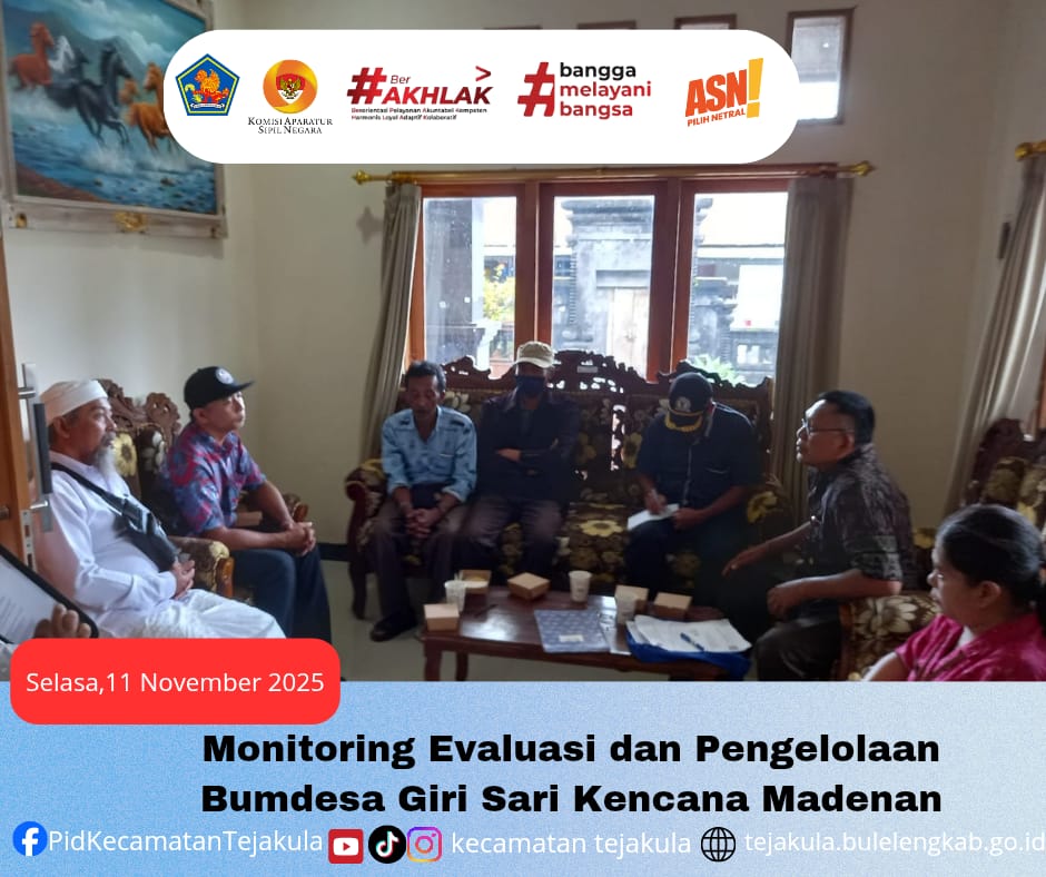 Madenan, Selasa, 11 November 2025. Kasi Pembangunan Kecamatan Tejakula berserta staf mengadakan acara Monitoring Evaluasi dan Pengelolaan Bumdesa Giri Sari Kencana di Desa Madenan bertempat di Kantor Desa Madenan.